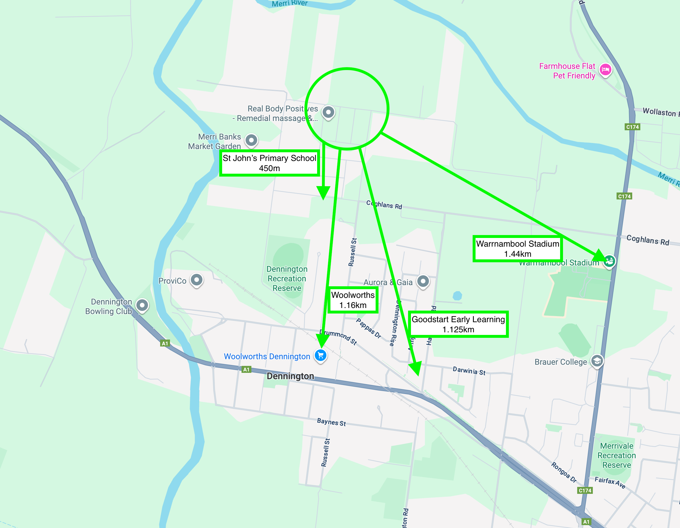 Location: Prime central position — 1.1km to Woolworths, 450m to St Johns Primary, 1.1km to Goodstart Early Learning, and 1.4km to Warrnambool Stadium.